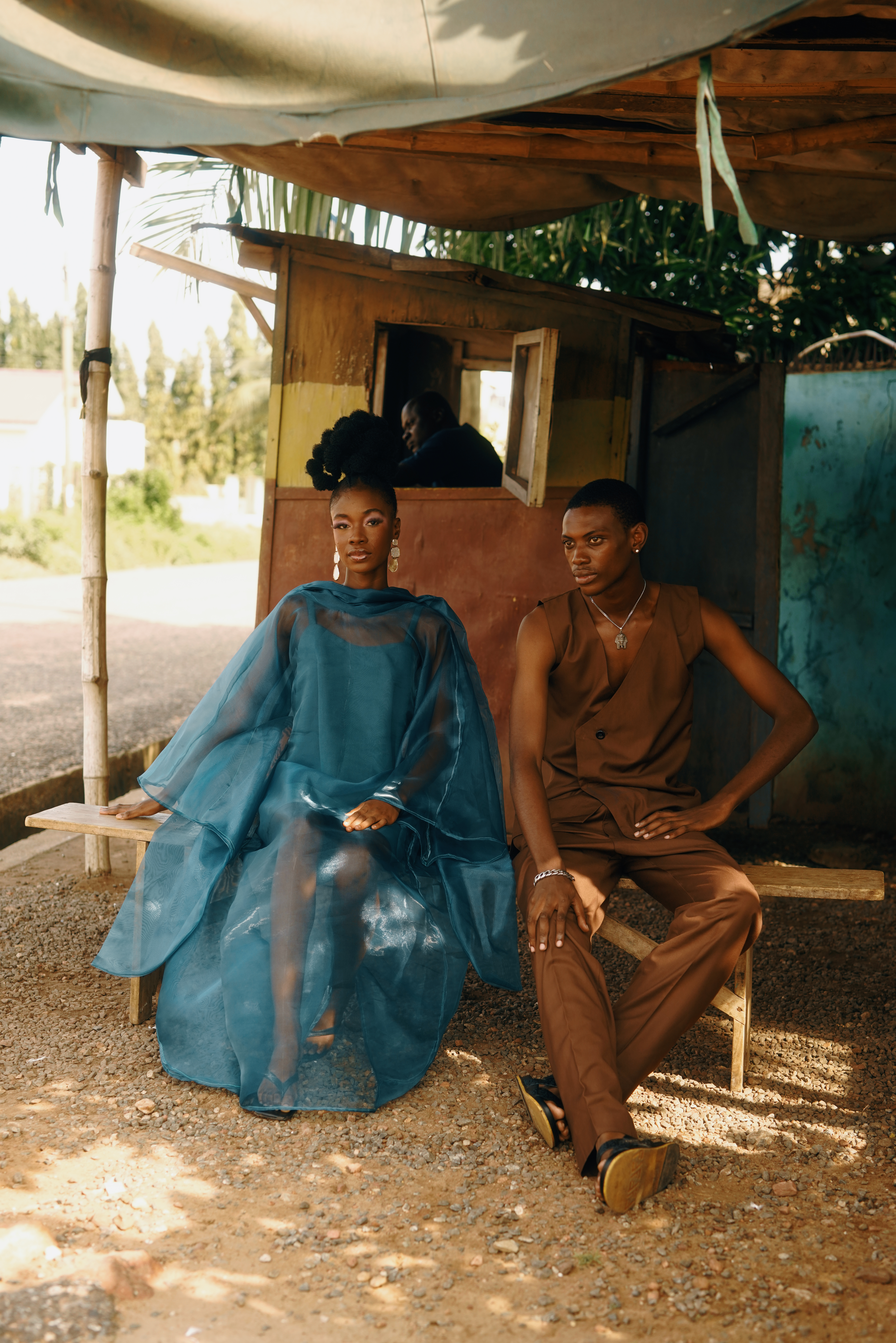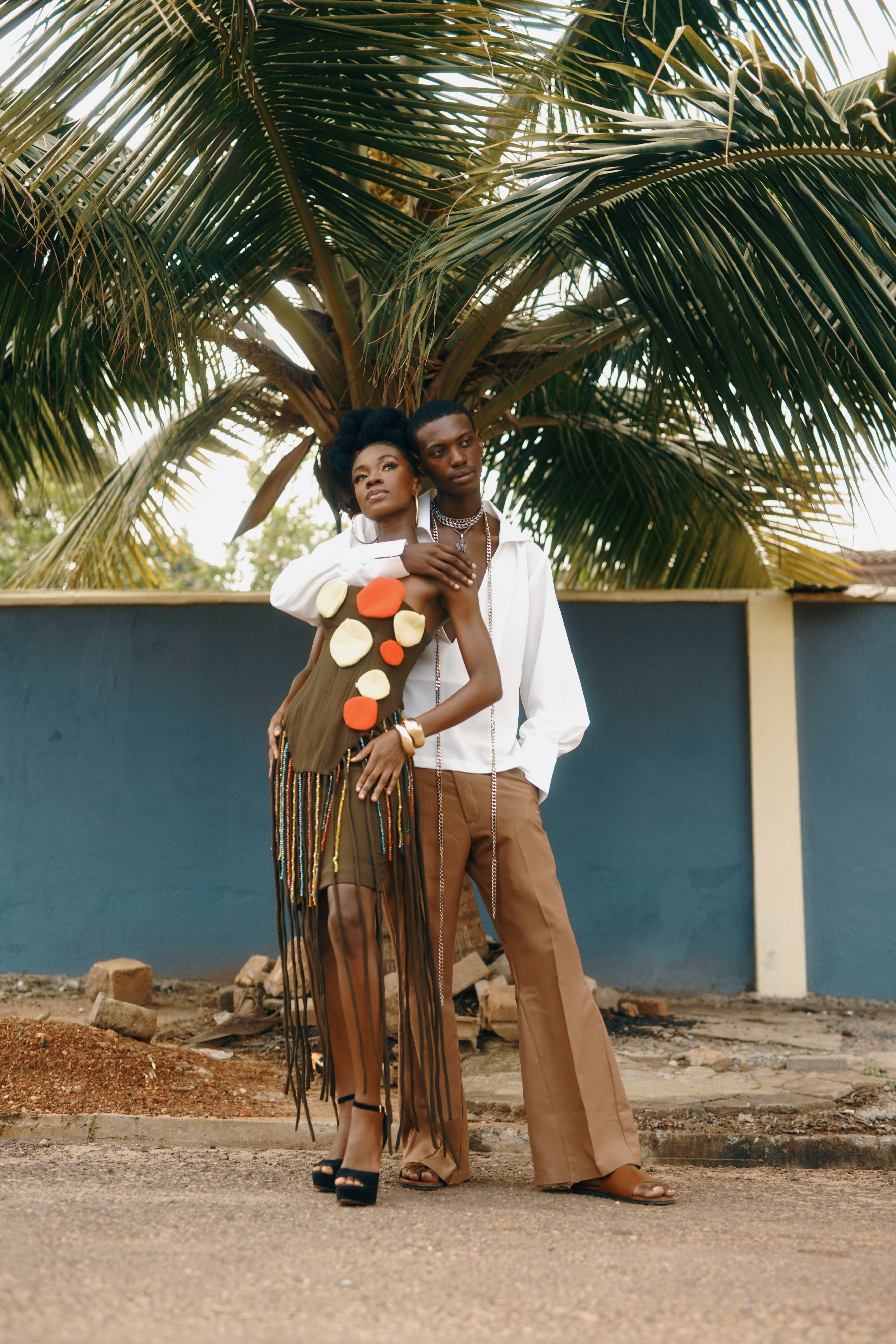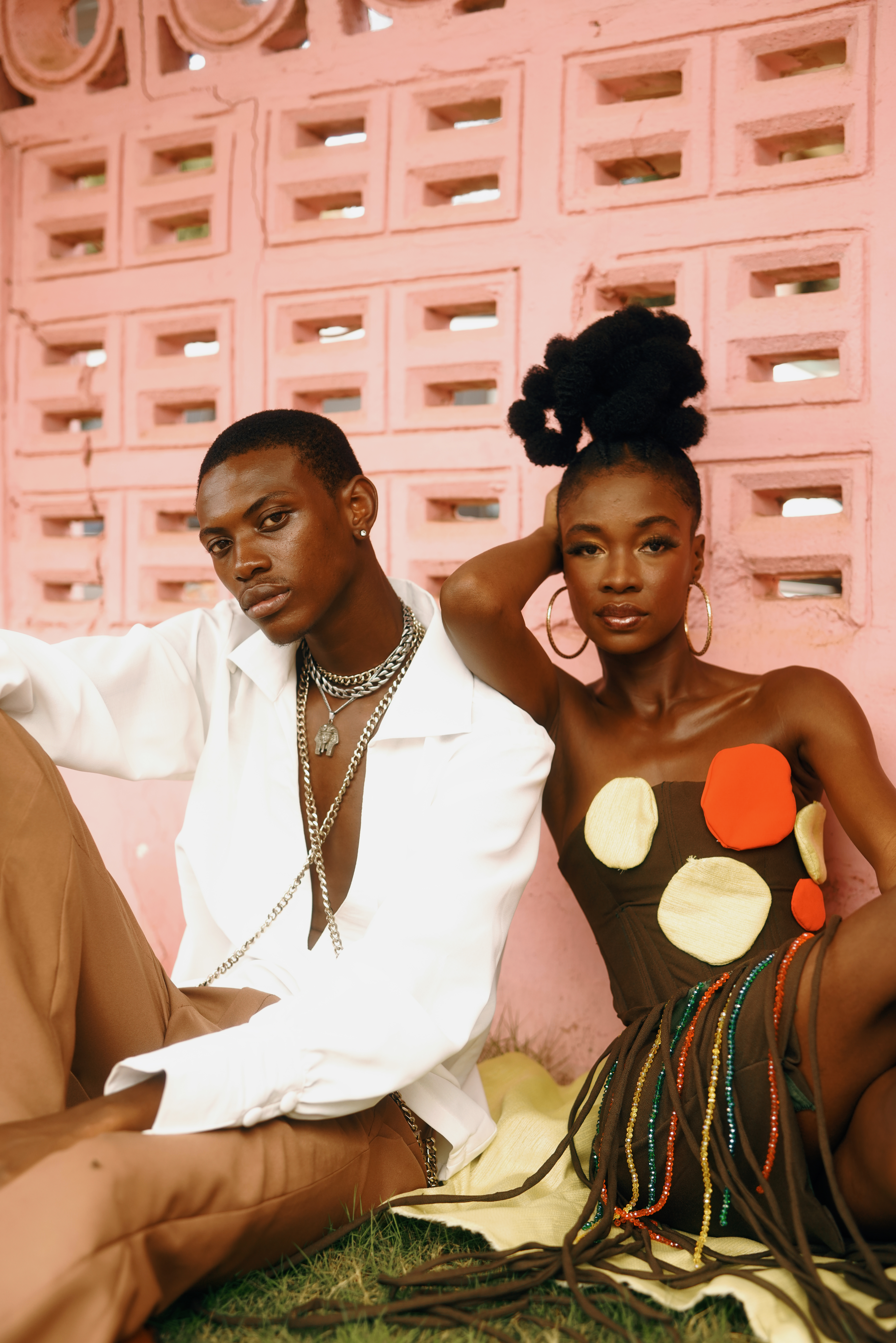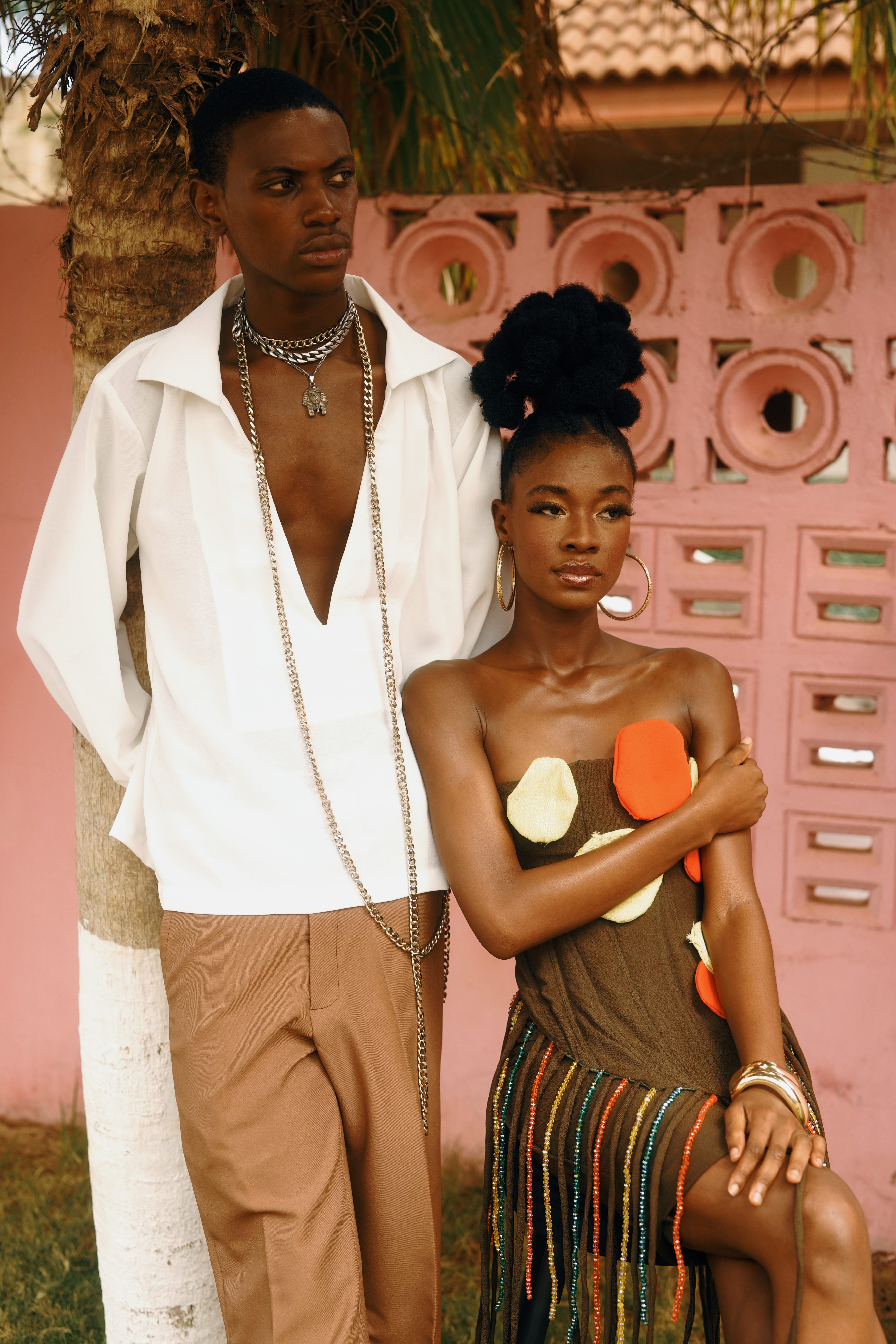 I was given full design freedom for this photoshoot. I combined traditional African textiles with metallic tulle. The female’s two-piece set was designed to give the illusion of a skirt when standing together. In actuality it was a layered wide leg pant. The male outfit was a high waist paper bag pant with pleats along the waist. It came with a matching chest band and a v-neck shirt made of black scuba fabric.