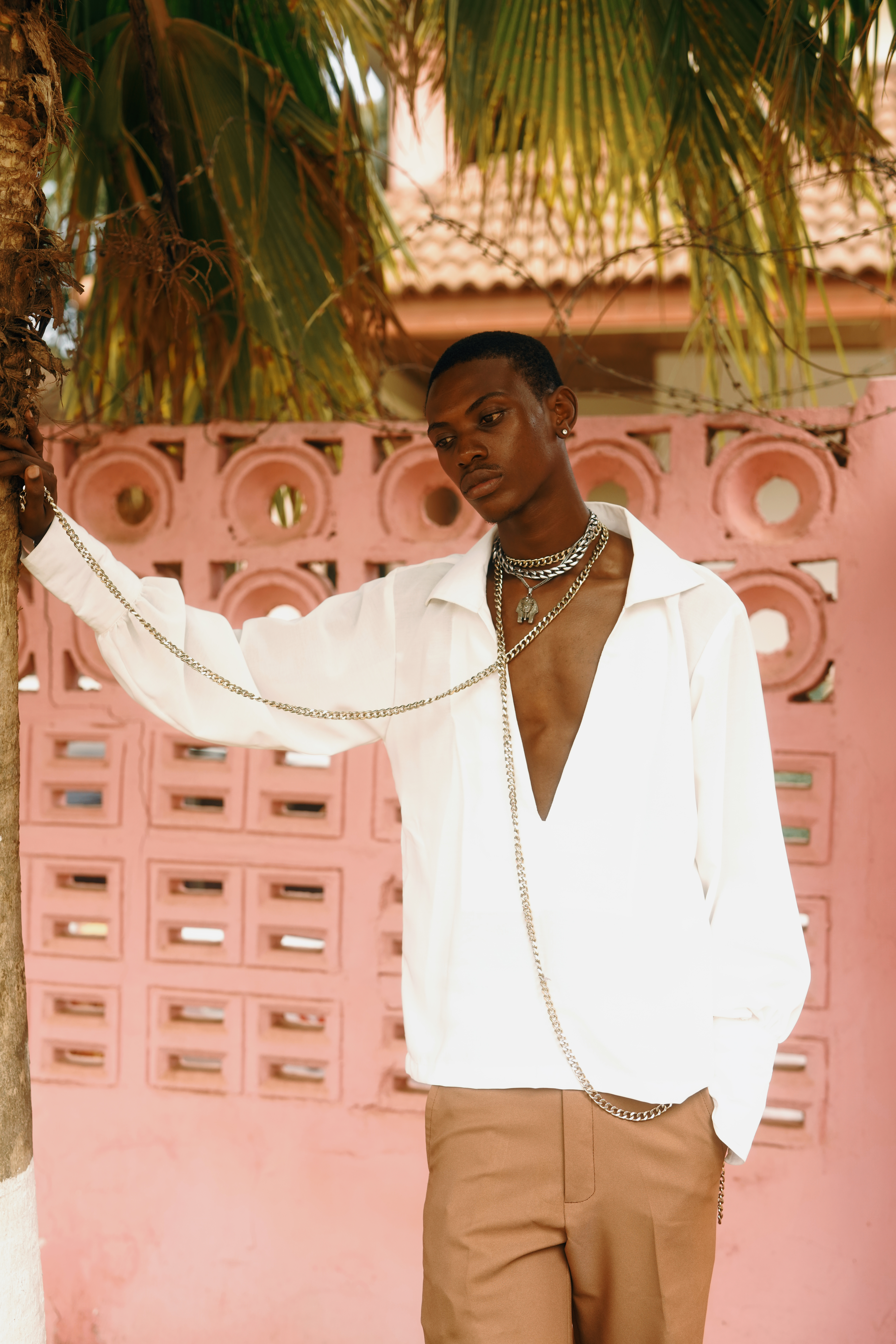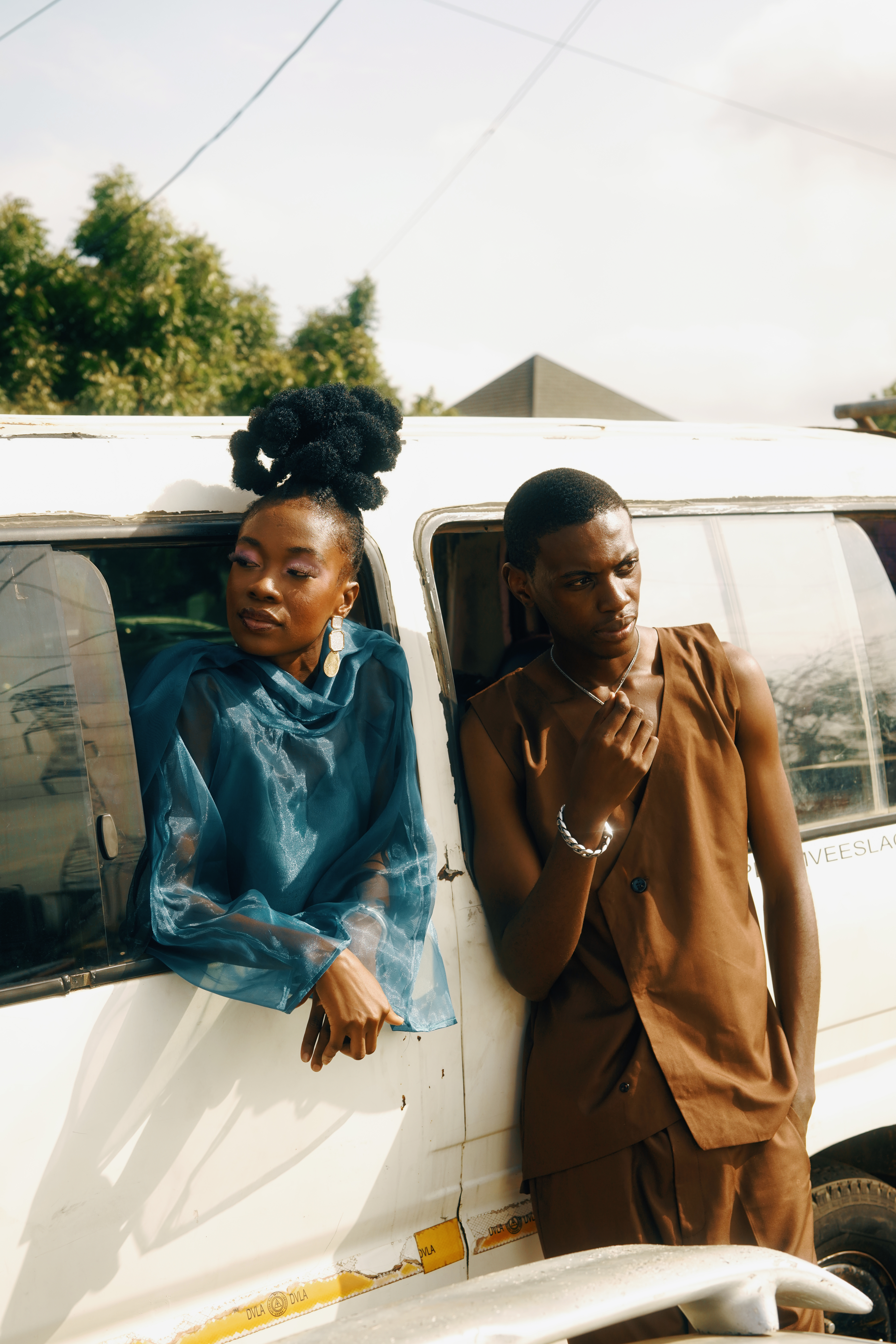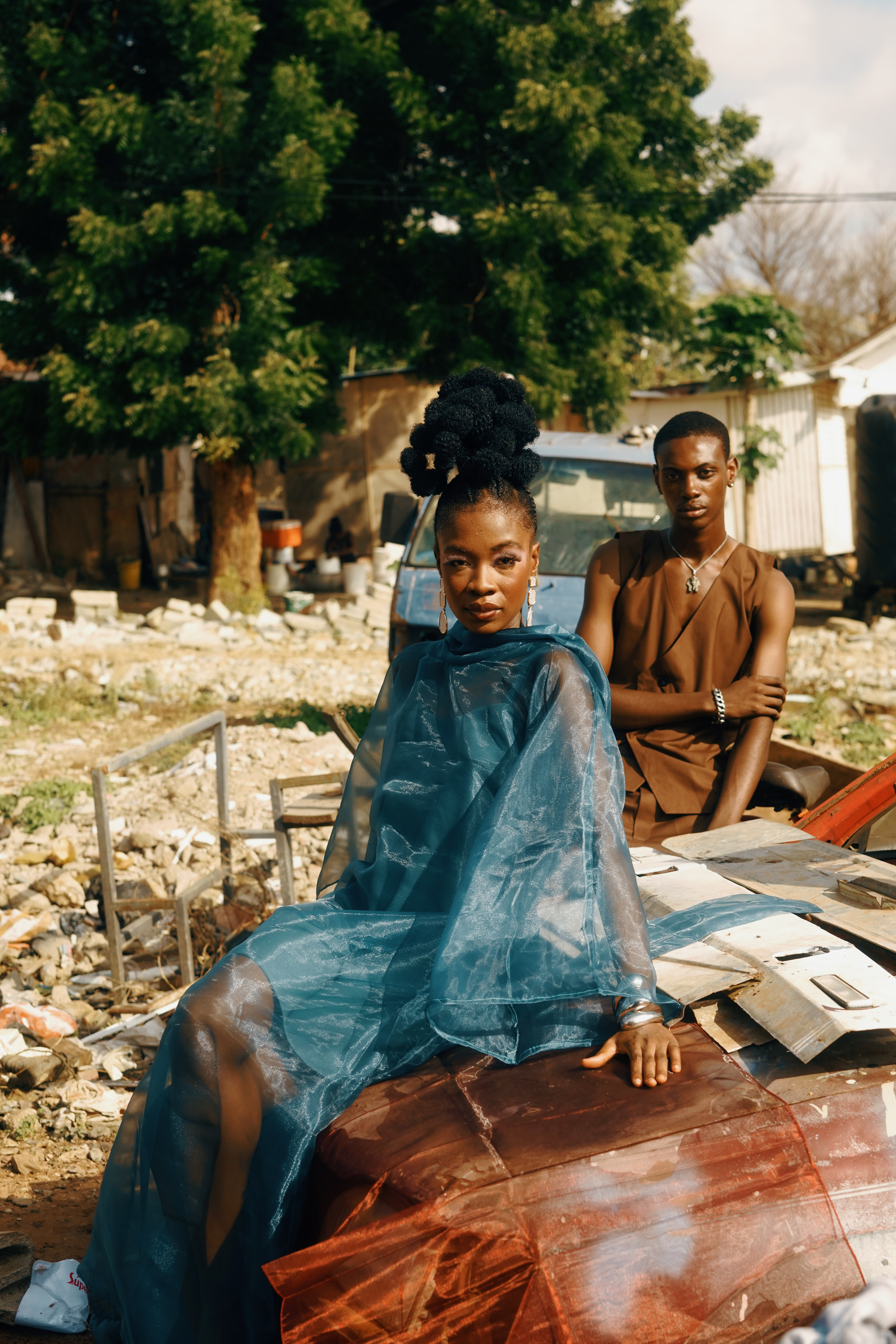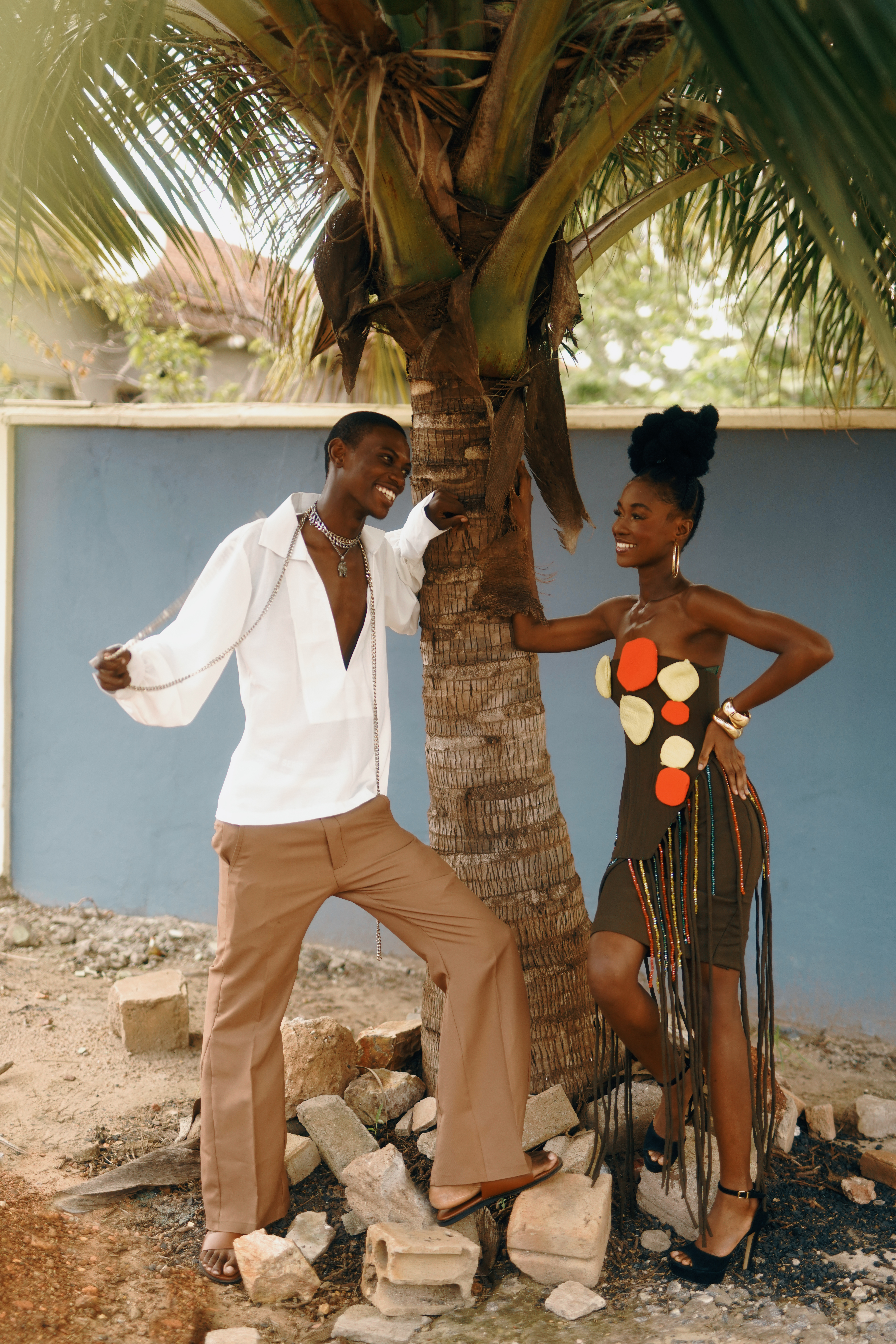 I was given full design freedom for this photoshoot. I combined traditional African textiles with metallic tulle. The female’s two-piece set was designed to give the illusion of a skirt when standing together. In actuality it was a layered wide leg pant. The male outfit was a high waist paper bag pant with pleats along the waist. It came with a matching chest band and a v-neck shirt made of black scuba fabric.